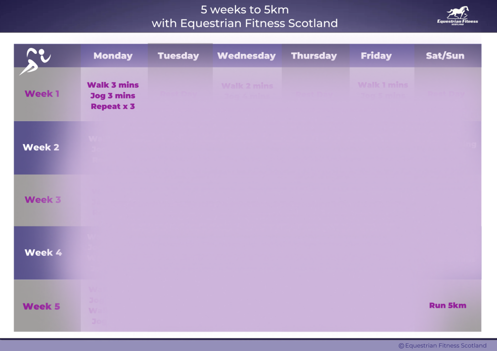 I have given myself another kick up the bum and decided to start running again, alongside my strength workouts and physio exercises. I made a start on the Equestrian Fitness Scotland Five Week to 5km plan which I have used before and it is brilliant, I am way too impatient to do the 10 week plan, but five weeks seems really achievable